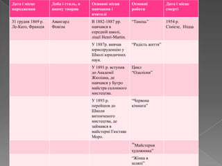 1. Життя АнріМатісадо того, як він став художником.Видатний французький художник, народився 31 грудня 1869 в Ле-Като на півночі Франції. Вінбув старшим сином у родиніЕміляМатісаіАнниЖерар. Йогодитячі роки пройшли в сусідньомумістечкуБоен-ан-Вермандуа, де йогобатько, торговець зерном, мав лавку. Матизахоплюваласярозписомкераміки.