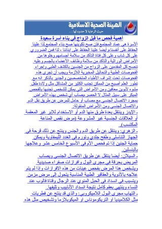 تتناول الوثيقة أهمية فحص ما قبل الزواج لضمان صحة الأفراد وتجنب الأمراض الوراثية والمعدية. تشدد على ضرورة إجراء الفحوصات الطبية تحت إشراف متخصصين، حيث يمكن أن يساعد الفحص المبكر في تجنب مشاكل صحية مثل الأمراض المنقولة جنسياً التي قد تؤثر على الصحة الإنجابية. تهدف النصائح المقدمة إلى بناء أسر سليمة وصحية وبالتالي مجتمع قوي.