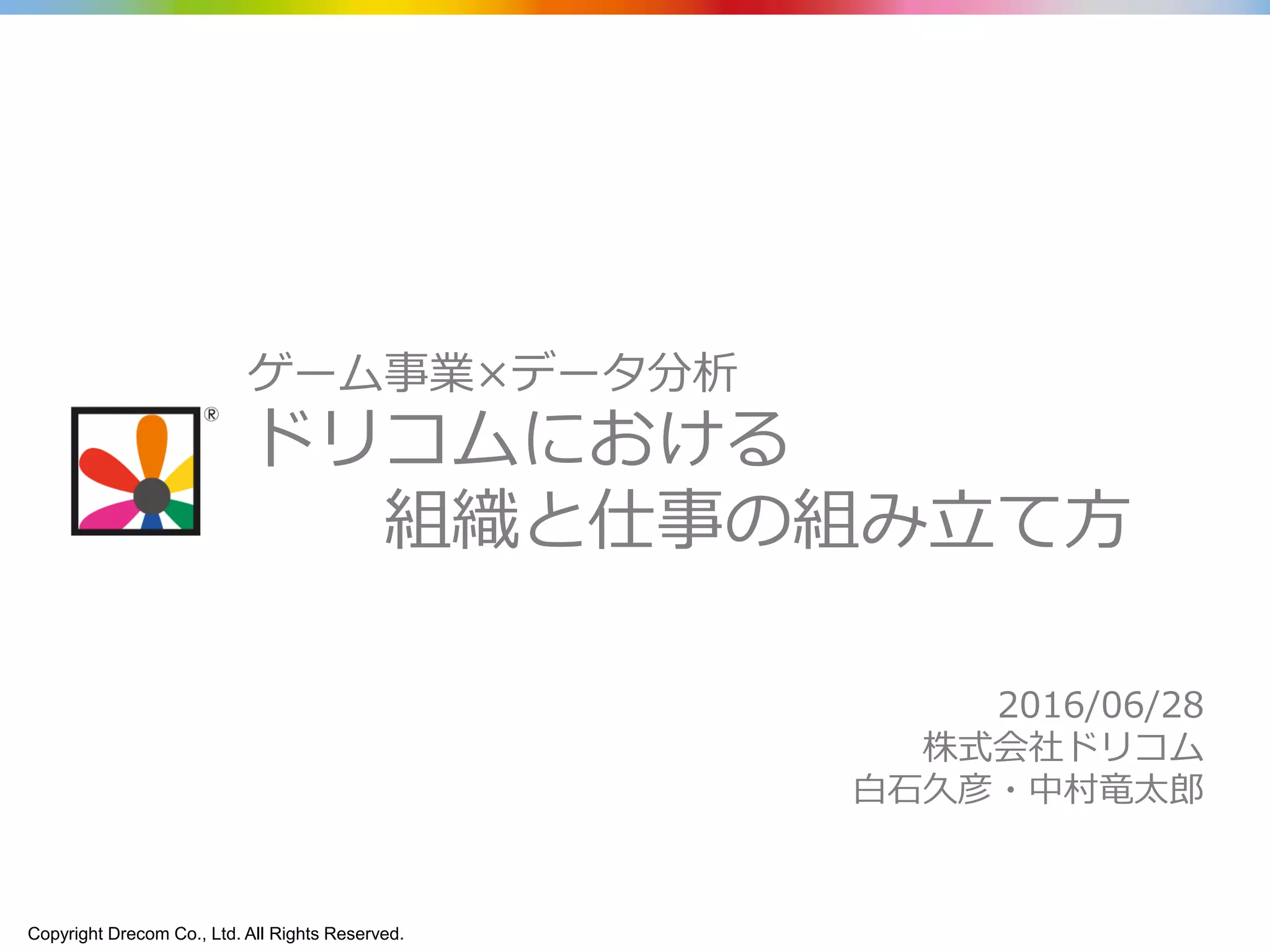 Ltd. All Rights Reserved. ゲーム事業×データ分析 ドリコムにおける 組織と仕事の組み立て方 2016/06/28 株式会社ドリコム 白石久彦・中村竜太郎