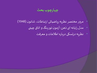 مرور مختصر نظریه ریاضیاتی ارتباطات، شانون (1948) مدل رایانه ای ذهن: آزمون تورینگ و اتاق چینی نظریه درتسکی درباره اطلاعات و معرفت