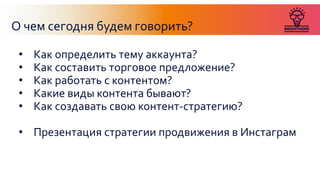 Документ представляет собой подробный гайд по продвижению в Instagram, включая определение темы аккаунта, создание уникального торгового предложения и разработку контент-стратегии. Рассматриваются различные виды контента и методы вовлечения, такие как сотрудничество с лидерами мнений и таргетированная реклама. В документе также описаны навыки, необходимые для успешного ведения аккаунта, включая копирайтинг и персонализацию бренда.
