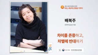 장애여성은 장애를 가지고 살아가는 여성들을 말합니다. 장애여성이 장애와 여성이라는 다층적이고 다중적인 (장애)차별이나 (젠더)폭력을 경험하는 것은 장애여성의 낮은 위치성때문이라 생각합니다. 다른 몸으로 살아가는 장애여성들의 삶을 공감하기 위해서 함께 살아가는 우리사회 소수자의 위치를 읽을 수 있어야 합니다.