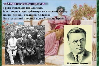 Група київських неокласиків, їхнє творче кредо, орієнтири на класичну форму поезій («Київ традиція» М. Зеров) і багатогранний творчий шлях Миколи Зерова