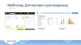 Документ описывает функционал облачного сервиса 'МойСклад' для управления торговлей, предназначенный для владельцев и кассиров. Он поддерживает работу на различных устройствах, офлайн-режим и включает функции по работе с фискальным оборудованием, обработке платежей и учету товара. Также представлены возможности настройки акций и персонализации услуг для клиентов.