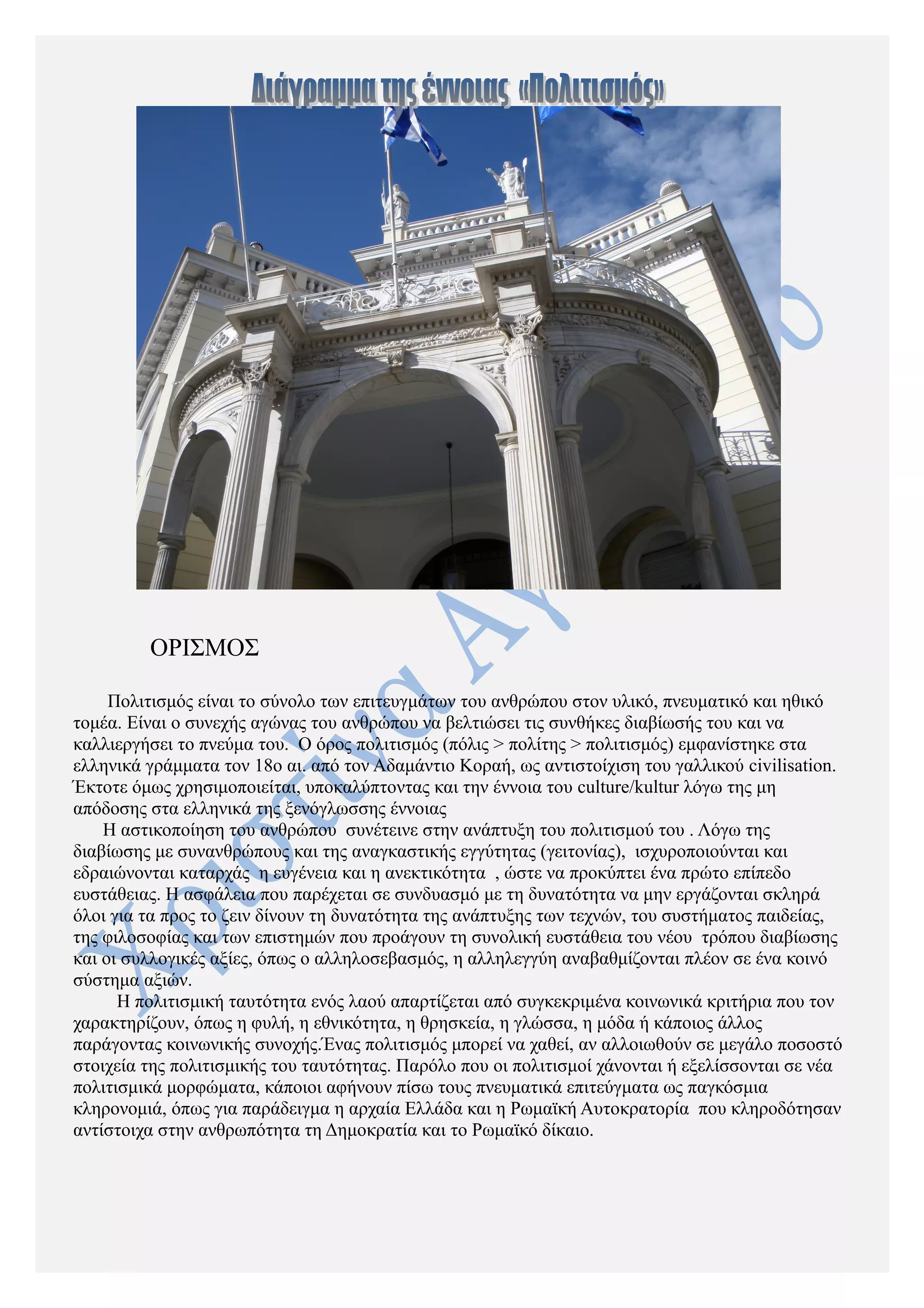 τέχνη, αξίες, παραδόσεις, παιδεία, μόρφωση, αισθητική, εκλέπτυνση συμπεριφοράς) που συνισταμένα