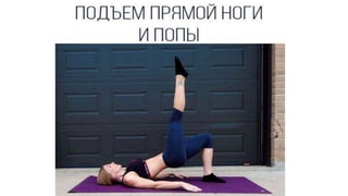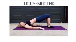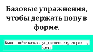 Документ описывает базовые упражнения для поддержания физической формы. Рекомендуется выполнять каждое упражнение 15-20 раз и повторить три круга. Также упоминается подготовка презентации по проекту.