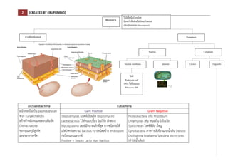 BY KRUPUMBIO] Archaeabacteria Eubacteria ผนังเซลลไมเปน peptidoglycan พวก Euryarchaeota สรางกาซมีเทนและชอบเค็มจัด Crenachaeota ชอบอุณหภูมิสูงจัด และชอบกรดจัด Gam Positive Gram Negative Stepto(myces แบคทีเรียผลิต steptomycin) Lacto(bacillus ไวทํานมเปรี้ยว โยเกิรต ผักดอง) Myco(plasma เซลลมีขนาดเล็กที่สุด บางชนิดกอให เกิดโรคปอดบวม) Bacillus (บางชนิดสราง endospore กอโรคแอนแทรกซ) Positive = Stepto Lacto Myo Bacillus Proteobacteria เชน Rhizobium Chlamydias เชน หนองใน โกโนเรีย Spirochetes โรคซิฟลิส ฉี่หนู Cynobacteria สาหรายสีเขียวแกมน้ําเงิน (Nostoc Oscillatoria Anabaena Spirulina Microcystis (ทําใหน้ําเสีย)) Monera ไมมีเยื่อหุมนิวเคลียส มีคลอโรฟลลแตไมมีคลอโรพลาส เปนผูยอยสลาย (Decomposer) สวนที่หอหุมเซลล Protoplasm Nucleus Cytoplasm Nuclear membrane plasmid ไมมี Prokayotic cell DNA ไมมี histone Ribosome 70S Cytosol Organelle