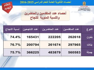 تقدم الوثيقة إحصاءات حول نسب النجاح للطلاب في الصفوف الدراسية للأعوام 2015 و2016، مع تفصيل بيانات النجاح حسب الجنس ونوع المدارس. أظهرت البيانات أن نسبة نجاح البنين كانت 74.4% والبنات 76.7%، ليكون المعدل العام 75.7%. كما توضح الوثيقة درجات النجاح حسب نوع المدرسة، حيث سجلت المدارس الخاصة أعلى نسب نجاح.