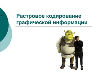 Документ описывает виды компьютерной графики, в частности растровое и векторное изображения, а также методы кодирования черно-белых и цветных изображений. В нем обсуждаются принципы представления графической информации в двоичной и десятичной системах счисления, включая детали о пикселях и цветовой палитре. Также представлены практические задания, связанные с визуализацией графики через рисование черно-белых изображений и эксперименты с цветами в программе Paint.