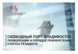 Документ описывает преференции и порядок получения статуса резидента свободного порта Владивосток для 20 муниципальных образований. В нем указаны налоговые льготы и критерии отбора резидентов, включая минимальный объем капитальных вложений и виды деятельности, не подлежащие налоговым льготам. Также представлен порядок подачи заявки и необходимые документы для получения статуса резидента.