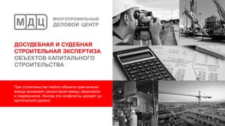 Документ описывает услуги по строительной экспертизе, возникающие между заказчиком и подрядчиком, включая определение объема, стоимости выполненных работ и качества. Компания предлагает свои услуги по всей России, гарантируя конфиденциальность и высокое качество работы. Указаны примеры выполненных экспертиз и определенные суммы по различным проектам в строительстве.