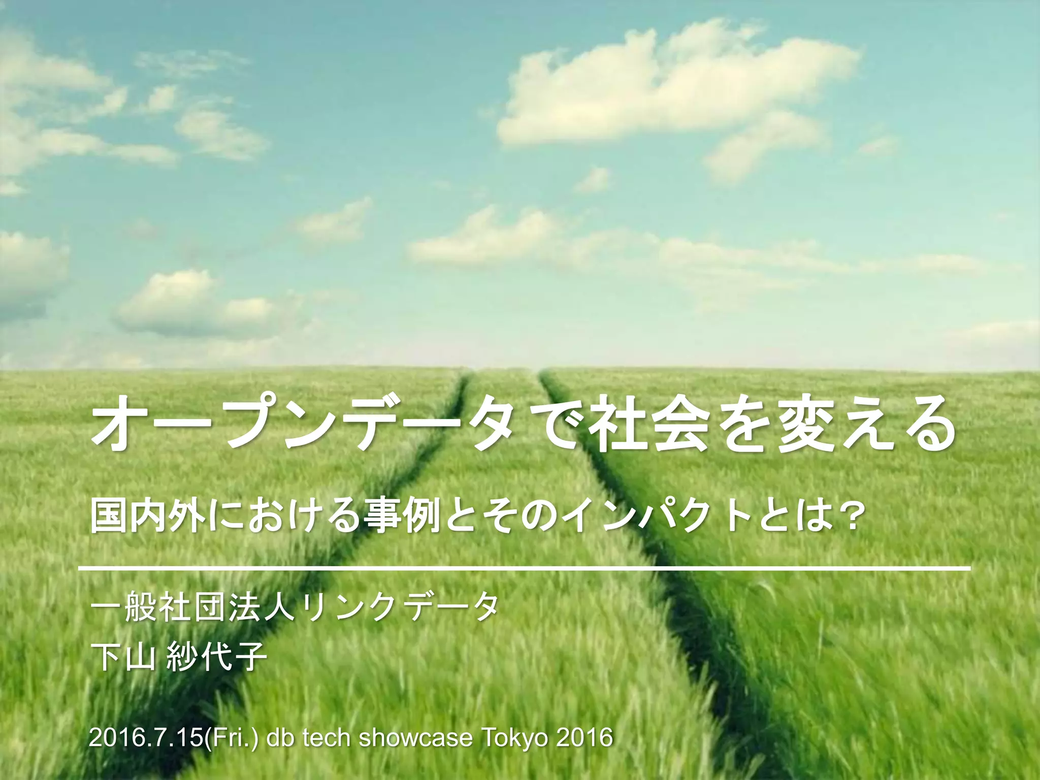 [要旨] 組織や個人が所有していたデータを、誰でも自由に使えるオープンデータへ。データを公共財として広く共有し、社会課題の解決やビジネスの創出につなげるための「オープンデータ」の取り組みが進められています。本セッションでは、国内外のユニークなオープンデータの事例紹介から、オープンデータがもたらす社会的な変革の予想までを幅広く解説します。また、散在するデータをWeb上で効率的に扱うためのLinked Open Dataの技術についてもご紹介します。