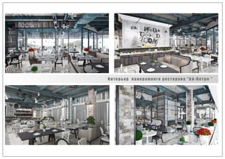 Документ описывает различные интерьерные решения и архитектурные проекты для кафе и ресторанов на территории отелей, таких как 'Greenpark' и 'Ялта Интурист'. Включены детали панорамного ресторана 'Ай-Петри' и водного бара 'Инфинити'. Также упоминается коммерческая визуализация и частные интерьеры.