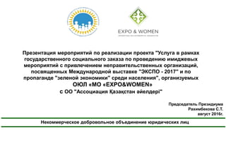 Документ описывает мероприятия по реализации проекта, посвященного выставке 'Экспо-2017', с акцентом на вовлечение женщин и продвижение 'зеленой экономики'. Включены планы семинаров и круглых столов на темы развития туризма, ремесел, и женского вклада в экономику в преддверии выставки. Меморандум о сотрудничестве подписан между неправительственными организациями для организации имиджевых мероприятий и привлечения участников.