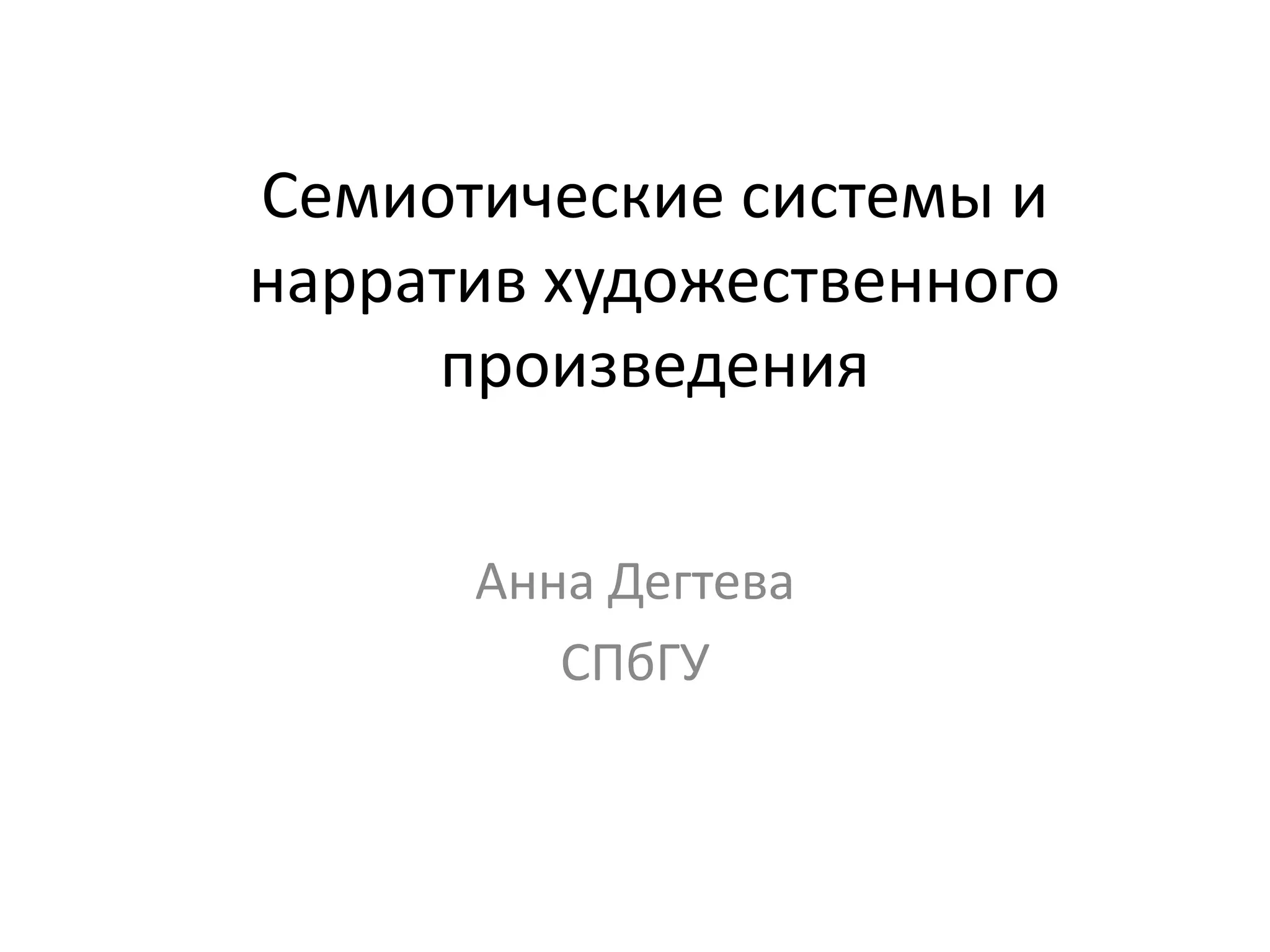 Документ обсуждает семиотические системы и их применение в нарративе художественных произведений, выделяя роль знаковых систем в интерпретации текста. Рассматриваются различные аспекты знаков, включая их классификацию и уровни значения, такие как архетипическое и культурное. Особое внимание уделяется связи языка и текста в контексте художественной литературы.