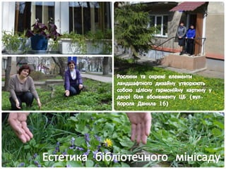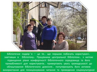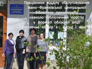З метою підвищення рівня комфортності бібліотечного середовища та його привабливості для користувачів, посилюючи роль бібліотеки, як центра читацьких, інформаційних, просвітницьких інтересів місцевої громади, дбаючи про благоустрій території, як прилягає до бібліотеки, покращуючи дизайн, створюючи фірмовий стиль бібліопростору, бібліотечні працівники відділу обслуговування Івано-Франківської центральної бібліотеки у форматі обласної акції "Бібліотечне подвір'я: фасад і мінісад" пропонують слайд-презентацію, яка представляє навколо-бібліотечний простір.