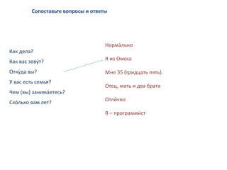Документ содержит набор фраз и вопросов для знакомства между людьми в самолете, включая информацию о двух персонажах – Максиме и Гале, а также их жизненных обстоятельствах и домашних животных. Приведен диалог, описывающий, как начать разговор, ответить на вопросы и представиться. Также представлены рекомендации по заполнению пробелов в вопросах и ответах о личной информации.
