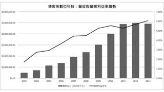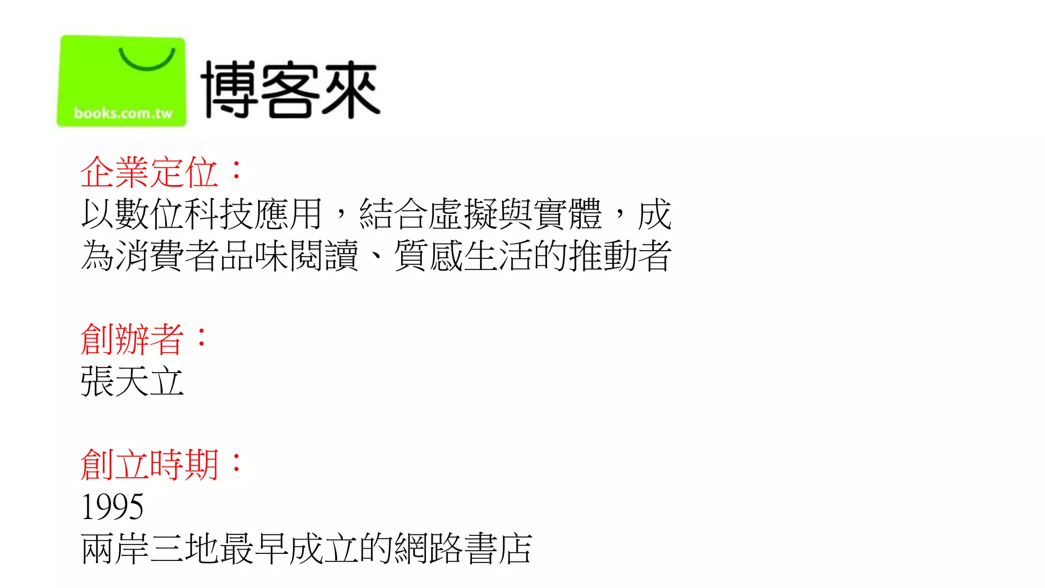 博客來網路書店成立於1995年,致力於結合數位科技與虛擬實體,推動消費者的閱讀與生活品味。其主要合作夥伴包括3000家出版社及各類文創業者,並提供方便的物流與支付服務,強調高效的顧客關係及生活風格的商品。該公司目前的營收為50億,與其他競爭對手相比仍有增長空間。