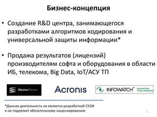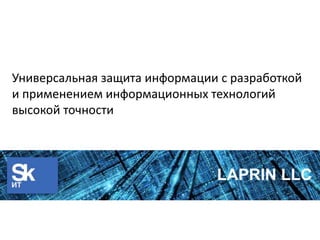 Документ описывает бизнес-концепцию компании Laprin LLC, разрабатывающей технологии универсальной защиты информации с акцентом на высокую скорость, надежность и защиту данных. Команда проекта состоит из экспертов с богатым опытом в области разработки и защиты информации, и компания планирует продавать лицензии на свои технологии производителям программного обеспечения и оборудования. Финансовый план предполагает рост выручки через контрактную разработку и продажу лицензий, а также возможный выход на IPO через три года.
