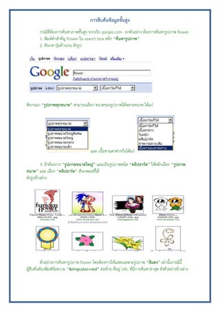 ยกตัวอย่าง ต้องการค้นหารูปภาพ flower …….. 1. พิมพ์คาสาคัญ flower ใน search box คลิก “ค้นหารูปภาพ” …….. 2. สังเกต ปุ่มด้านบน ดังรูป พิจารณา “รูปภาพทุกขนาด” สามารถเลือก ขนาดของรูปภาพได้หลายขนาด ได้แก่ และ เนื้อหาแตกต่างกันได้แก่ 3. ถ้าต้องการ “รูปภาพขนาดใหญ่” และเป็นรูปภาพชนิด “คลิปอาร์ต” ให้คลิกเลือก “รูปภาพ ขนาด” และ เลือก “คลิปอาร์ต” สังเกตผลที่ได้ ดังรูปข้างล่าง ตัวอย่างการค้นหารูปภาพ flower โดยต้องการให้แสดงเฉพาะรูปภาพ “สีแดง” เท่านั้นกรณีนี้ ผู้สืบค้นต้องพิมพ์ข้อความ “&imgcolor=red” ต่อท้าย ที่อยู่ URL ที่มีการค้นหาล่าสุด ดังตัวอย่างข้างล่าง