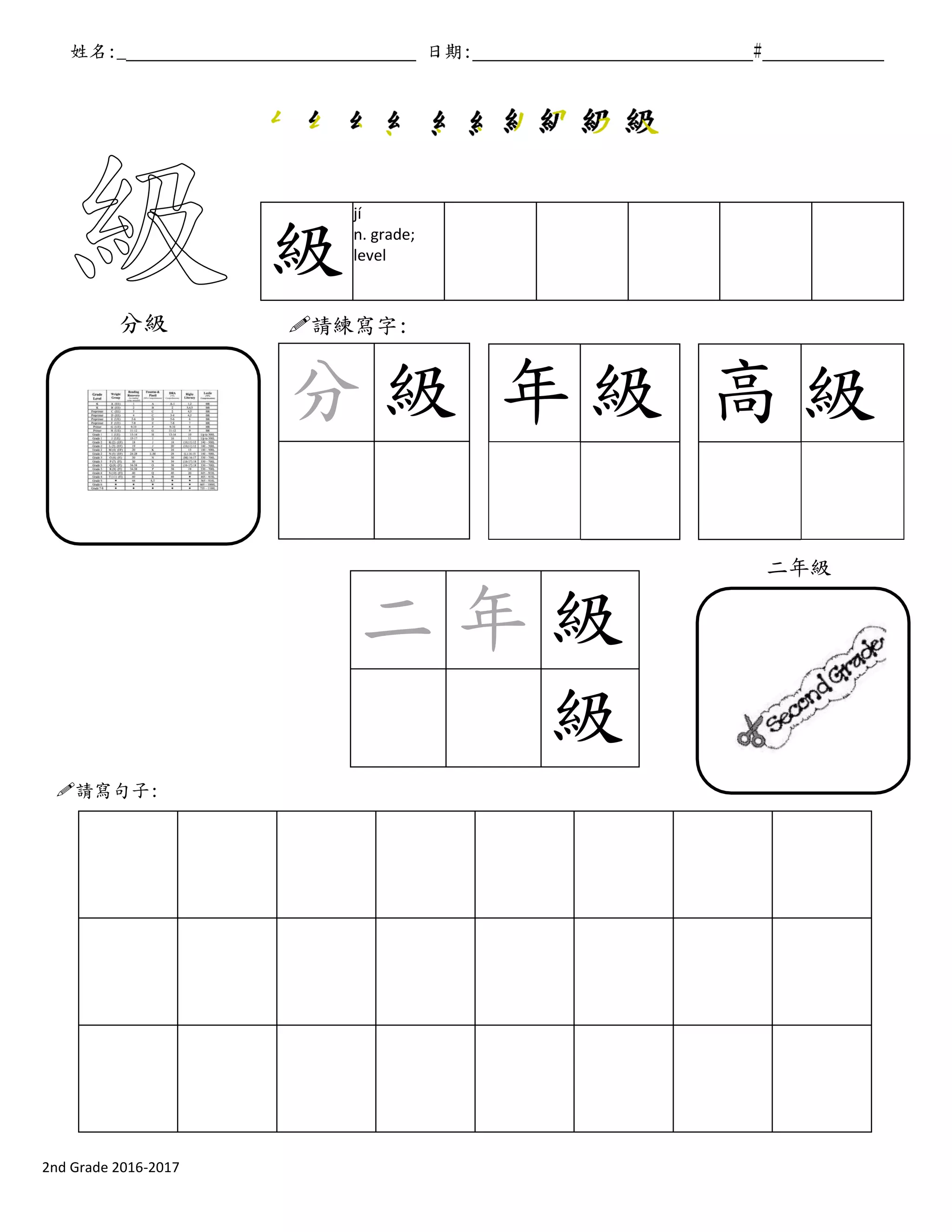 級 高 級 二 年 級 級 姓名:_ 日期: # 級 jí n. grade; level grad g 分級 請練寫字: 二年級 請寫句子: 分 級