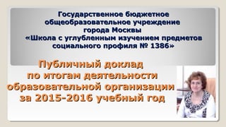 Доклад подводит итоги деятельности ГБОУ Школы № 1386 за 2015-2016 учебный год, охватывая различные аспекты образовательного процесса, включая общие сведения, содержание образовательной деятельности и мониторинг качества образования. Он также обсуждает материально-техническое обеспечение, кадровый состав, безопасность и организацию питания в школе. Документ подчеркивает важность инновационных технологий обучения и поддержки талантливых детей в образовательном процессе.