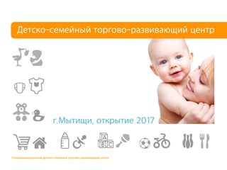 Документ описывает Specialized Children's and Family Trade Development Center в Мытищах, открывшийся в 2017 году, с акцентом на привлечение семей с детьми в результате ближайшего жилого строительства и пассажиропотока на станции. Ожидается, что центр будет посещать около 10 000 человек в день, предлагая широкий ассортимент товаров и услуг для детей и родителей. Основная концепция центра заключается в создании дружественного пространства для детей и семей, с акцентом на экологически чистые продукты и услуги.