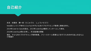 「子どもにプログラミングを学ぶ場をもっと提供したい」というテーマでプレゼンを行いました。 私は子どもにプログラミングを教える「CoderDojo堺」を主宰していまして、大阪を子ども向けプログラミング教育が盛んな街として盛り上げていきたいと思っています。 詳しくは https://www.submit.ne.jp/7266