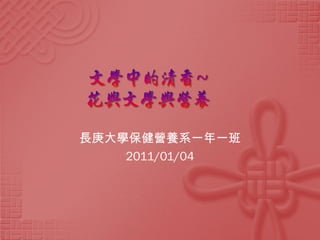 本文件讨论了花的营养价值,包括精神和物质方面,特别强调了樱花的文化意义和营养成分。介绍了与樱花相关的日本美学、文人及历史背景,以及茉莉花和玫瑰花的食用和药用价值。最后,文中提及茶文化与著名人物对茶的品鉴及其在中国文化中的重要性。