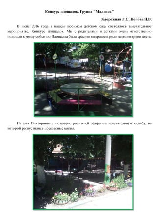 В июне 2016 года в детском саду состоялся конкурс площадок, в котором группа 'малинка' приняла активное участие. Родители и дети совместно подготовили площадку, украсив её яркими цветами и интересными атрибутами, включая оригинальную табличку с названием группы. В итогах конкурса группа получила награду и призы за свои усилия.