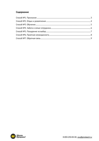 Документ содержит семь способов мотивации сотрудников, включая признание, отдых, обучение, заботу о семье, выбор поощрений, приятные неожиданности и обратную связь. Каждый способ предложен с примерами, показывающими, как его можно эффективно реализовать. Основная цель всех методов - повысить удовлетворенность сотрудников и улучшить атмосферу в коллективе.