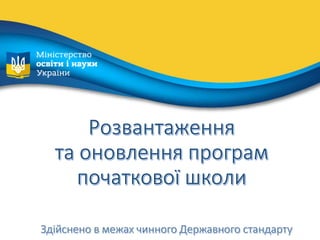 Шкільні програми початкової школи розвантажені з 13 предметів. У цих програмах знято фіксовану кількість годин на вивчення кожної теми, вчитель самостійно їх визначає, а також дублювання змісту у навчальних предметах «Основи здоровʼя», «Я у світі», «Природознавство». Ключовими змінами також є те, що процес навчання приведено у відповідність до вікових можливостеймолодших школярів, а термінологію програм уніфіковано.