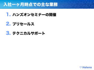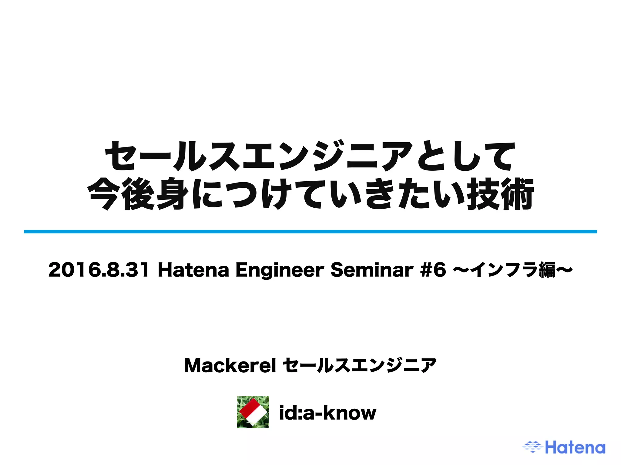 This document provides information about three different events and opportunities. It announces a meetup about the Mackerel monitoring service to be held on February 21st in Tokyo. It also shares a link to an open-source home server project on GitHub called a-know-home-server. Finally, it includes a link to a job posting for a sales engineer position at Hatena.