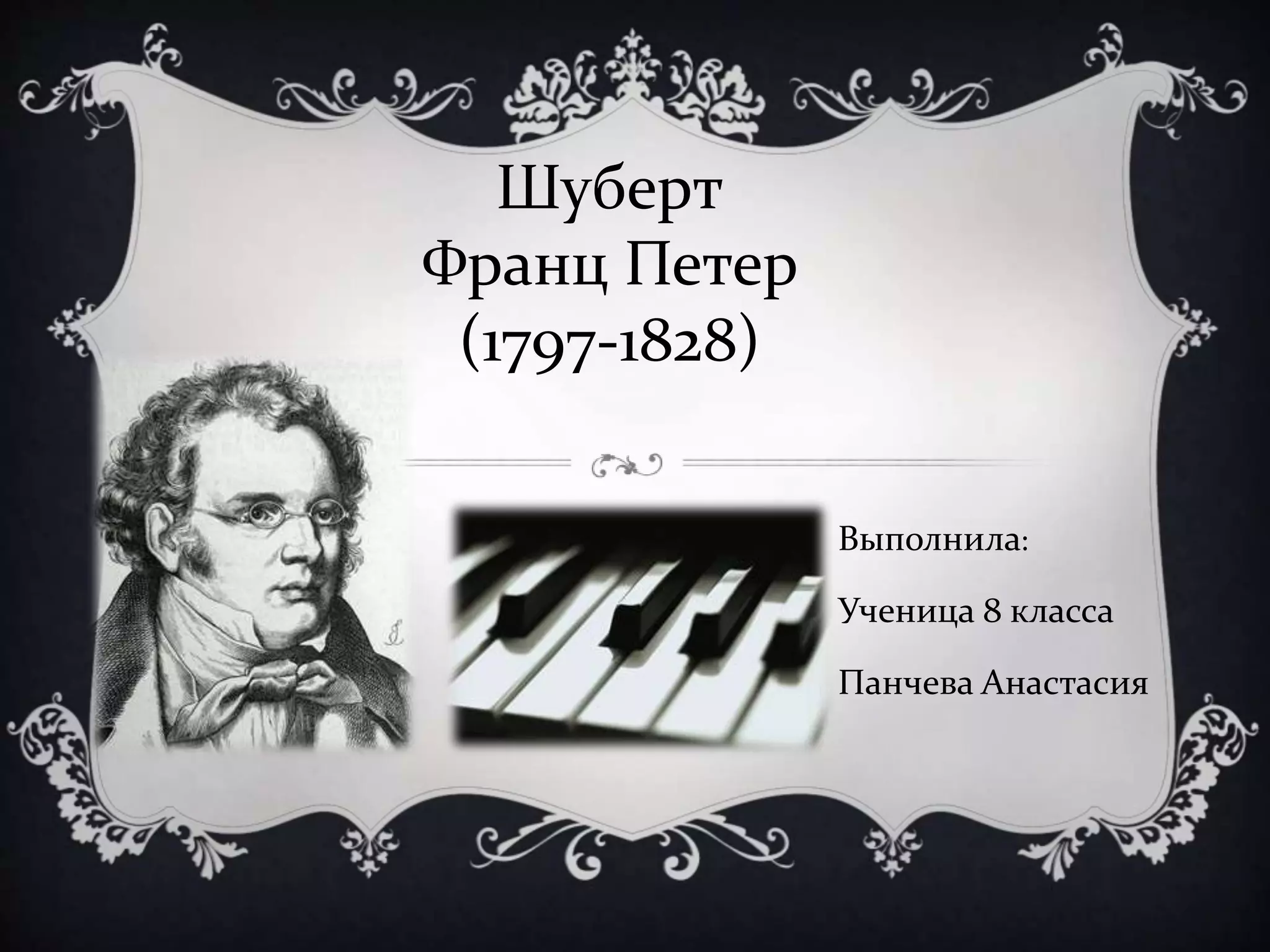 Франц Петер Шуберт (1797-1828) был австрийским композитором, проявившим музыкальные таланты с раннего детства и создавшим значительное количество произведений, включая более 600 песен. Его творчество, характеризующееся глубокой эмоциональной выразительностью, оказало влияние на романтизм, несмотря на то, что многие работы были опубликованы только после его смерти. Шуберт скончался в возрасте 31 года от тифа, так и не дождавшись признания во время своей жизни.