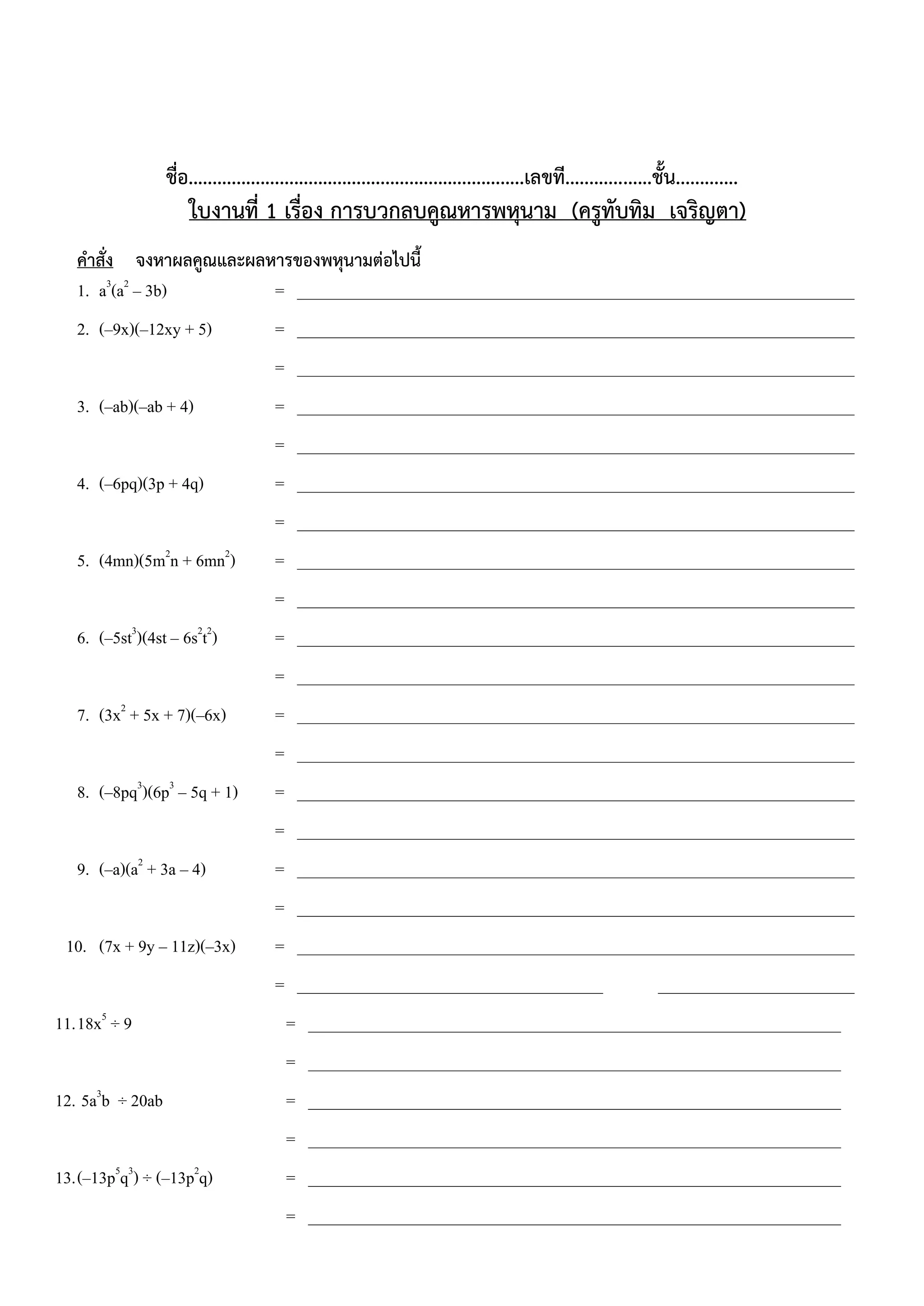 The document contains 29 math problems involving polynomial multiplication and division. Students are asked to calculate the products and quotients of polynomials such as (a3 - 3b), (-9x)(-12xy + 5), and (4mn)(5m2n + 6mn2). They are also asked to perform division of polynomials like 18x5 ÷ 9, (-13p5q3) ÷ (-13p2q), and (-15ab4 + 3a2b2 - 21b3) ÷ 3b2. The problems cover a range of operations with monomials and polynomials of varying degrees.