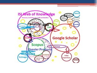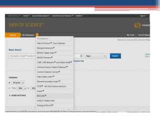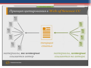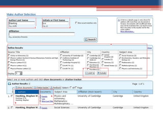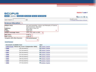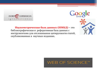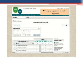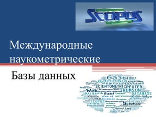 Документ описывает международные наукометрические базы данных, такие как Scopus и Web of Science, которые служат для отслеживания цитируемости научных статей. Подробно рассматриваются функции, возможности и преимущества этих баз для исследователей и научных организаций, включая индексы цитируемости и авторские профили. Также обсуждается процесс регистрации и поиска авторов, организаций и журналов в базе данных Scopus.