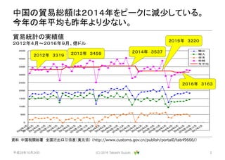 Takashi Suzuki . 2 資料:中国税関総署 全国进出口总值表(美元值) (http://www.customs.gov.cn/publish/portal0/tab49666/) 貿易総額と収支の年平均推移 2012年度~2017年度、億ドル 中国の貿易総額は2014年をピークにして、2年連続 で減少した。 3,385 229 195 406 504 409 420 3,319 3,500 3,537 3,220 3,194 0 1,000 2,000 3,000 4,000 2012 2013 2014 2015 2016 2017 貿易総額 収支 現時点の 集計