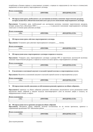 Документ описывает результаты общего собрания собственников помещений в многоквартирном доме, на котором принимались решения о различных вопросах, включая избрание председателя и секретаря, формирование счетной комиссии и заключение энергосервисного договора. Установлены условия, касающиеся экономии энергетических ресурсов, сроков договора и методов уведомления собственников о принятых решениях. А также предусмотрены порядок и условия оплаты энергосервисных услуг и хранение материалов собраний.