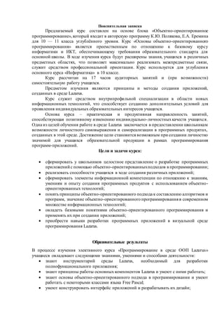 Документ представляет курс «Основы объектно-ориентированного программирования» для учащихся 10-11 классов, основанный на авторской программе К.Ю. Полякова и Е.А. Ерёмина. Курс направлен на углубление знаний в области информатики, охватывающий принципы создания приложений в среде Lazarus и способствующий развитию межпредметных связей и профессиональной ориентации. В процессе изучения студенты овладеют навыками разработки программного обеспечения, а также основами объектно-ориентированного подхода и современными информационными технологиями.
