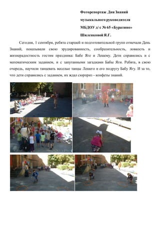 1 сентября в мбдоу д/с no 65 «Буратино» прошел праздник дня знаний, на котором старшая и подготовительная группы продемонстрировали свои знания и навыки. Дети успешно справились с математическими заданиями и загадками бабы яги, а также научили танцевать лешему и бабе яге. В конце праздника ребята получили сюрприз - конфеты знаний.
