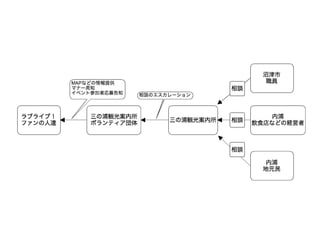 or KLab) • 第2クールまでに何がやれるかを決める • 沼津と内浦の差を埋める(内浦でお金が消費されないなら沼津 で消費されるルートを構築) • 安田旅館、淡島ホテル以外にも泊まってもらう • 大洗でわからなかったら秋葉原にいくべき • 神田明神、アトレにヒアリング • タイアップ専門の企業に相談する(見積もりだけでも) • ターゲット時期を絞る(年末年始、正月、2月のライブ前後な ど)