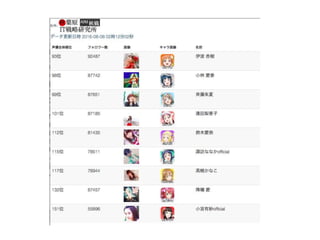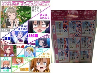 ラブライブ!の特徴2 人気投票 • 人気投票でセンターを決めるAKB48みたいなことを やっている。公式だけでなくショップ独自でやってる ところも多数