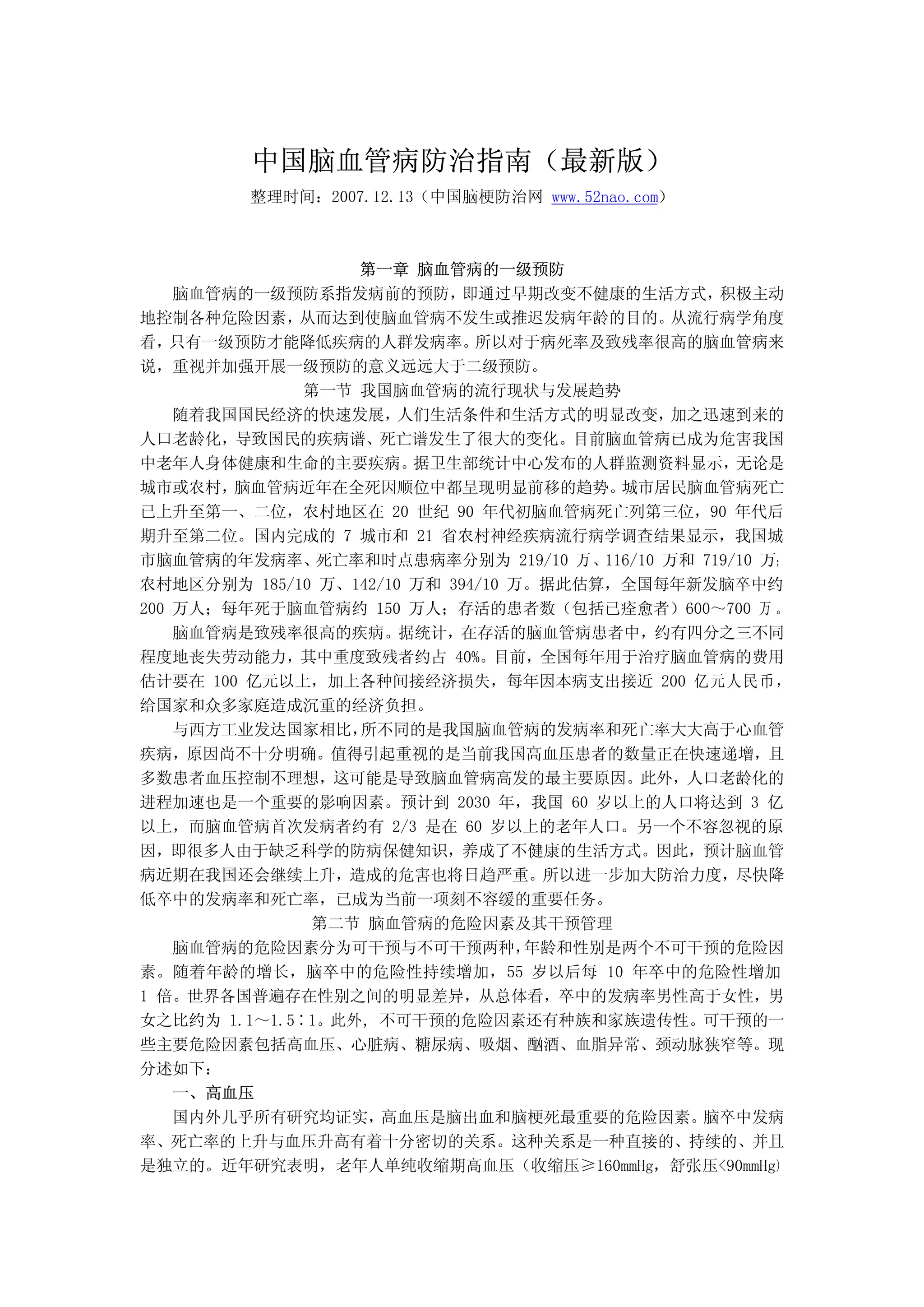 本指南讨论了中国脑血管病的一级预防与流行现状,强调控制危险因素如高血压的重要性。脑血管病在中老年人群中的发病率和死亡率逐年上升,主要归因于人口老龄化及不健康生活方式。为减少脑卒中发生,建议加强公众健康教育,并推广早期筛查和干预管理措施。