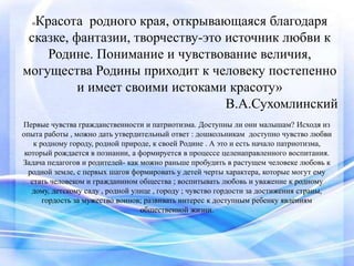 Документ описывает важность формирования чувства любви и патриотизма у детей в дошкольном возрасте через воспитание и открытие красоты родного края. Подчеркивается роль педагогов и родителей в пробуждении у малышей уважения к своей родине и окружающей природе. Приведены стихи и примеры, иллюстрирующие эту связь и любовь к родному городу, Колпино.