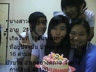 นางสาวดาวย้อย ภูชำนิอายุ 21 ปี เกิดวันที่ 11 ธันวาคม 2532 ที่อยู่ปัจจุบัน บ้านเลขที่ 112 หมู่ 16 ตำบล บัวบาน อำเภอยางตลาด จังหวัดกาฬสินธุ์ 46120 - 3.