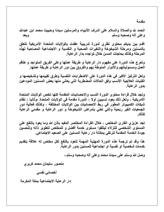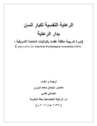 تناقش الوثيقة دورة تدريبية معتمدة من رابطة علم النفس الأمريكية تهدف إلى تحسين فهم الرعاية النفسية لكبار السن والتحديات المرتبطة بها. تحتوي الدورة على معلومات حول الصحة النفسية، الأمراض المرتبطة بالشيخوخة، التقنيات العلاجية، وأهمية تطوير مهارات مقدمي الرعاية. كما تشير إلى ارتفاع نسبة كبار السن في المجتمع وتأكيد الحاجة للرعاية المتخصصة في هذا المجال.
