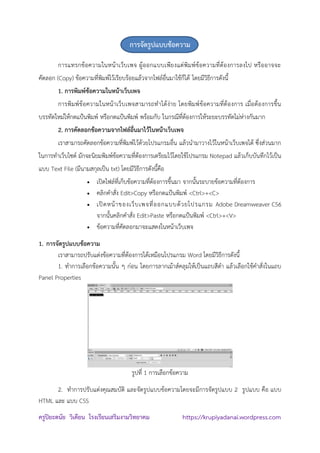 https://krupiyadanai.wordpress.com การจัดรูปแบบข้อความ การแทรกข้อความในหน้าเว็บเพจ ผู้ออกแบบเพียงแต่พิมพ์ข้อความที่ต้องการลงไป หรืออาจจะ คัดลอก (Copy) ข้อความที่พิมพ์ไว้เรียบร้อยแล้วจากไฟล์อื่นมาใช้ก็ได้ โดยมีวิธีการดังนี้ 1. การพิมพ์ข้อความในหน้าเว็บเพจ การพิมพ์ข้อความในหน้าเว็บเพจสามารถทาได้ง่าย โดยพิมพ์ข้อความที่ต้องการ เมื่อต้องการขึ้น บรรทัดใหม่ให้กดแป้นพิมพ์ หรือกดแป้นพิมพ์ พร้อมกับ ในกรณีที่ต้องการให้ระยะบรรทัดไม่ห่างกันมาก 2. การคัดลอกข้อความจากไฟล์อื่นมาไว้ในหน้าเว็บเพจ เราสามารถคัดลอกข้อความที่พิมพ์ไว้ด้วยโปรแกรมอื่น แล้วนามาวางไว้ในหน้าเว็บเพจได้ ซึ่งส่วนมาก ในการทาเว็บไซต์ มักจะนิยมพิมพ์ข้อความที่ต้องการเตรียมไว้โดยใช้โปรแกรม Notepad แล้วเก็บบันทึกไว้เป็น แบบ Text File (มีนามสกุลเป็น txt) โดยมีวิธีการดังนี้คือ เปิดไฟล์ที่เก็บข้อความที่ต้องการขึ้นมา จากนั้นระบายข้อความที่ต้องการ คลิกคาสั่ง Edit>Copy หรือกดแป้นพิมพ์ <Ctrl>+<C> เปิดหน้าของเว็บเพจที่ออกแบบด้วยโปรแกรม Adobe Dreamweaver CS6 จากนั้นคลิกคาสั่ง Edit>Paste หรือกดแป้นพิมพ์ <Ctrl>+<V> ข้อความที่คัดลอกมาจะแสดงในหน้าเว็บเพจ 1. การจัดรูปแบบข้อความ เราสามารถปรับแต่งข้อความที่ต้องการได้เหมือนโปรแกรม Word โดยมีวิธีการดังนี้ 1. ทาการเลือกข้อความนั้น ๆ ก่อน โดยการลากเม้าส์คลุมให้เป็นแถบสีดา แล้วเลือกใช้คาสั่งในแถบ Panel Properties รูปที่ 1 การเลือกข้อความ 2. ทาการปรับแต่งคุณสมบัติ และจัดรูปแบบข้อความโดยจะมีการจัดรูปแบบ 2 รูปแบบ คือ แบบ HTML และ แบบ CSS