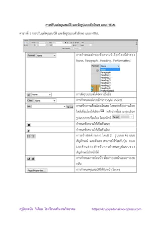 https://krupiyadanai.wordpress.com การปรับแต่งคุณสมบัติ และจัดรูปแบบตัวอักษร แบบ HTML ตารางที่ 1 การปรับแต่งคุณสมบัติ และจัดรูปแบบตัวอักษร แบบ HTML การกาหนดค่าของข้อความที่เลือกโดยมีค่าของ None, Paragraph , Heading , Performatted การจัดรูปแบบที่ได้จัดทาไว้แล้ว การกาหนดแม่แบบอักษร (Style sheet) การสร้างการเชื่อมโยงเว็บเพจ โดยหากต้องการเลือก ไฟล์เชื่อมโยงให้เลือก หลังจากนั้นสามารถเลือก รูปแบบการเชื่อมโยง โดยคลิกที่ กาหนดข้อความให้เป็นตัวหนา กาหนดข้อความให้เป็นตัวเอียง การสร้างลิสต์รายการ โดยมี 2 รูปแบบ คือ แบบ สัญลักษณ์ และตัวเลข สามารถใช้ร่วมกับปุ่ม Item List ด้านล่าง สาหรับการกาหนดรูปแบบของ สัญลักษณ์นาหน้าได้ การกาหนดการย่อหน้า ทั้งการย่อหน้าและการถอย กลับ การกาหนดคุณสมบัติให้กับหน้าเว็บเพจ