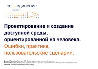 Документ рассматривает проектирование доступной среды и ошибки, возникающие при ее создании, акцентируя внимание на недостатке знаний у подрядчиков и архитекторов, а также недостаточном контроле со стороны государственных и общественных организаций. Предлагаются стратегические рекомендации для улучшения доступности, включая необходимость привлечения экспертов и разработки единой методологии. Основное внимание уделяется необходимой реабилитации и сотрудничеству всех заинтересованных сторон для создания комфортной и безопасной среды для людей с инвалидностью.