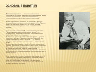 Документ описывает эриксоновский гипноз, основанный на методах сотрудничества между терапевтом и пациентом, без авторитарного вмешательства. Основные принципы включают использование языка пациента, доступ к бессознательным ресурсам и работу через косвенные внушения. Эриксоновский подход предполагает, что каждый человек способен входить в гипнотическое состояние, что делает эту методику более доступной по сравнению с традиционным гипнозом.